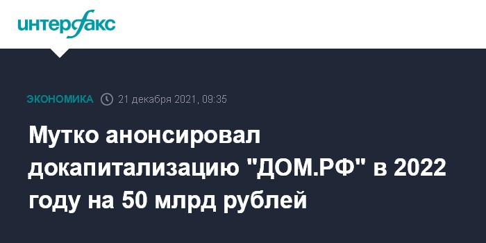 Москва. 21 декабря. INTERFAX.RU - В 2022 году правительство планирует докапитализировать госкорпорацию "ДОМ.РФ" на 50 млрд рублей, сообщил РБК глава госкорпорации Виталий Мутко. По его словам, президент этот план поддержал.