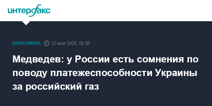 Москва. 22 мая. INTERFAX.RU - У России есть сомнения относительно возможностей Украина расплачиваться за поставленный газ, заявил президент России Дмитрий Медведев на пресс-конференции по окончании саммита РФ - ЕС в Хабаровске в пятницу.