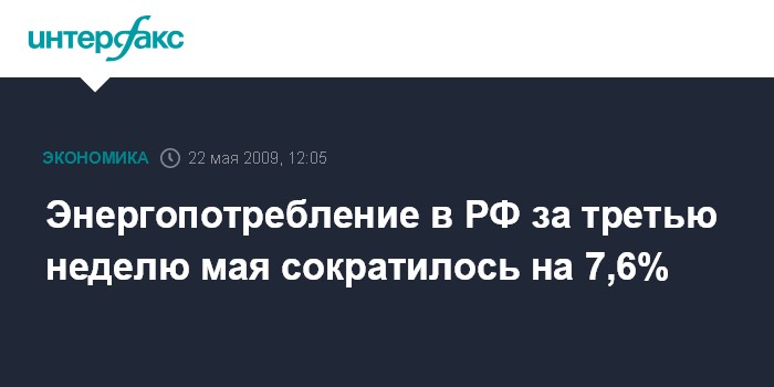 Москва. 22 мая. INTERFAX.RU - Энергопотребление в РФ за период с 15 по 21 мая сократилось на 7,6% по сравнению с аналогичным периодом прошлого года, говорится в сообщении НП "Совет рынка".