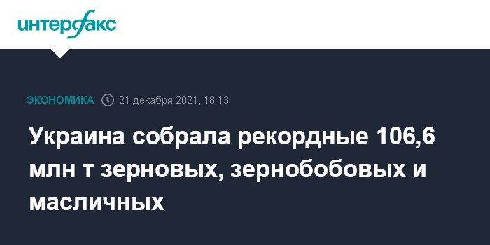 Москва. 21 декабря. INTERFAX.RU - Украина в 2021 году собрала рекордный урожай зерновых, зернобобовых и масличных культур в объеме 106,6 млн тонн, сообщил министр аграрной политики и продовольствия Украины Роман Лещенко в фейсбуке.