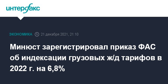 Минюст зарегистрировал приказ ФАС об индексации грузовых ж/д тарифов в 2022 г. на 6,8%