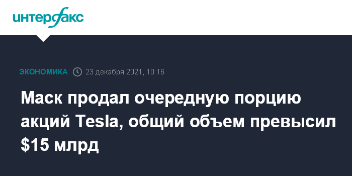 Москва. 23 декабря. INTERFAX.RU - Глава Tesla Inc Илон Маск продал очередную порцию бумаг производителя электромобилей, в результате чего общий объем проданных им акций компании превысил $15 млрд.