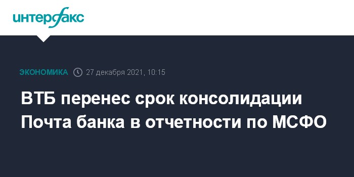 Москва. 27 декабря. INTERFAX.RU - ВТБ сдвинул срок консолидации результатов Почта банка в отчетности по МСФО за первый квартал 2022 года, сообщил журналистам финансовый директор ВТБ Дмитрий Пьянов.