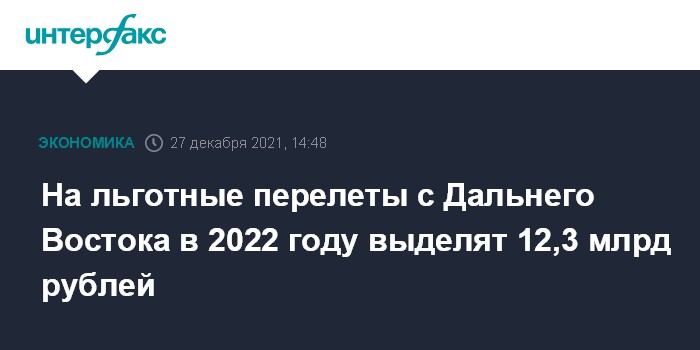 Москва. 27 декабря. INTERFAX.RU - В 2022 году на льготные авиаперелеты жителей Дальнего Востока в центральные регионы и обратно будет выделено 12,3 млрд рублей против 11,6 млрд рублей в 2021 году, сообщила пресс-служба аппарата полпреда президента в Дальневосточном федеральном округе Юрия Трутнева.