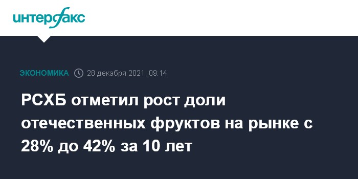 Москва. 28 декабря. INTERFAX.RU - На российском рынке за последние десять лет доля отечественных фруктов и ягод выросла с 28% до 42%, доля импорта снизилась с 72% до 58%, следует из анализа Россельхозбанка.