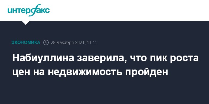 ЦБ РФ предупредил о риске удорожания жилья при продлении программы льготной ипотекиЧитать подробнее"У нас произошел серьезный рост цен на недвижимость, и мы где-то сейчас прошли этот пик цен на недвижимость. Я думаю, что они не будут расти такими темпами", - сообщила Набиуллина в интервью телеканалу "Россия 24".