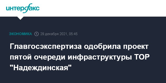Главгосэкспертиза одобрила проект пятой очереди инфраструктуры ТОР "Надеждинская"