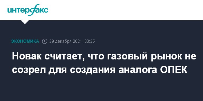 Москва. 29 декабря. INTERFAX.RU - Участники глобального газового рынка еще не готовы для создания глобального рыночного регулятора, аналогичного ОПЕК, считает вице-премьер Александр Новак. Он высказал это мнение РБК и добавил, что такие переговоры и не ведутся.