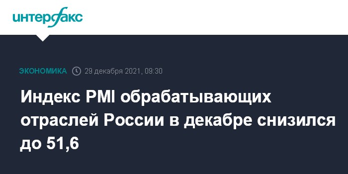 Москва. 29 декабря. INTERFAX.RU - В декабре индекс PMI обрабатывающих отраслей в России составил 51,6 пункта, слегка опустившись с ноябрьского значения 51,7 пункта, показало исследование IHS Markit.