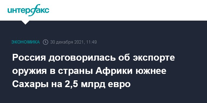 Москва. 30 декабря. INTERFAX.RU - Объем оружейных контрактов РФ со странами Африки южнее Сахары в 2021 году приблизился к 2,5 млрд евро. Об этом сообщил глава "Рособоронэкспорта" Александр Михеев.