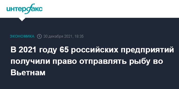 Москва. 30 декабря. INTERFAX.RU - Вьетнам разрешил еще 39 российским предприятиям поставки рыбы на свой рынок. Об этом сообщает Россельхознадзор со ссылкой на информацию департамента здоровья животных министерства сельского хозяйства и аграрного развития Вьетнама (DAH).
