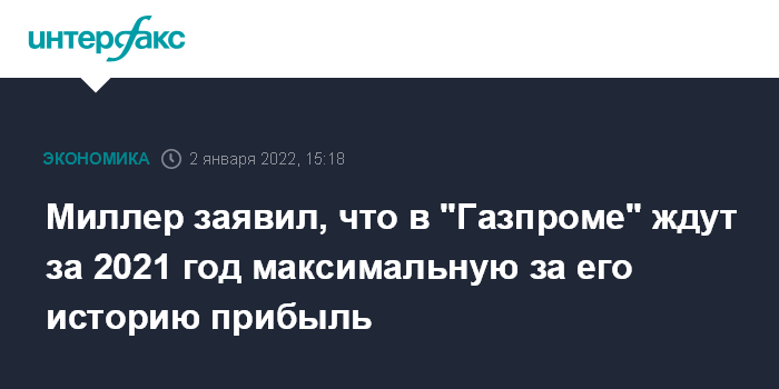 Москва. 2 января. INTERFAX.RU - Максимальную за историю корпорации прибыль и дивиденды ожидает руководство "Газпрома" за 2021 год, заявил в воскресенье председатель правления "Газпрома" Алексей Миллер.