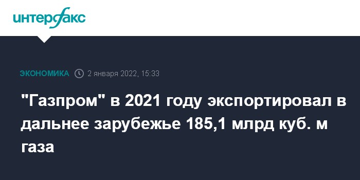 Москва. 2 января. INTERFAX.RU - "Газпром" в 2021 году экспортировал в дальнее зарубежье 185,1 млрд куб. м газа - на 5,8 млрд куб. м больше, чем в 2020 году, заявил в воскресенье председатель правления концерна Алексей Миллер.