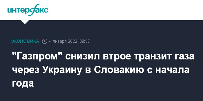 Москва. 4 января. INTERFAX.RU - Прокачка российского газа через Украину в направлении Словакии в первых числах января 2022 года упала втрое, свидетельствуют данные словацкого газотранспортного оператора Eustream.