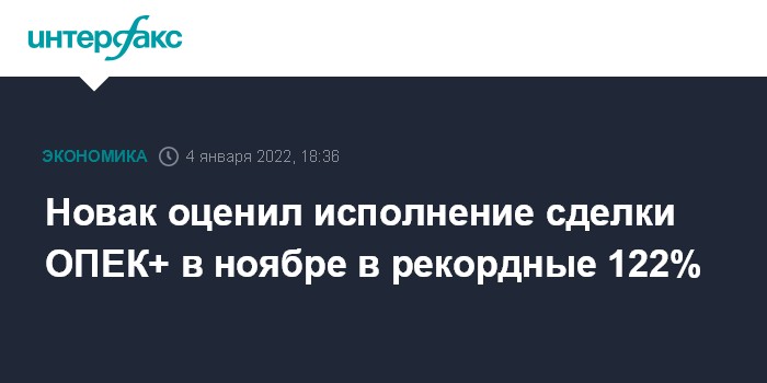 Он отметил, что в ходе заседания ОПЕК+ 4 января было рассмотрено, в первую очередь, исполнение сделки за ноябрь прошлого года, "она была на исторически максимальном уровне - 122%".