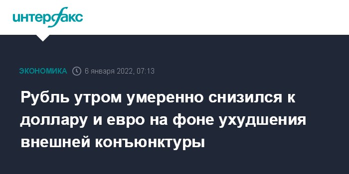 По мнению экспертов "Интерфакс-ЦЭА", снижение курса рубля к доллару и евро на старте торгов 6 января обусловлено, прежде всего, ухудшением ситуации на мировых рынках капитала, в том числе развернувшимися вниз в рамках коррекции ценами на нефть. Поводами для активизации продавцов могли послужить как опасения возможного скорого повышения процентных ставок Федрезервом США, так и статистика распространения нового штамма "омикрон" COVID-19, что негативно скажется на темпах восстановления мировой экономики.