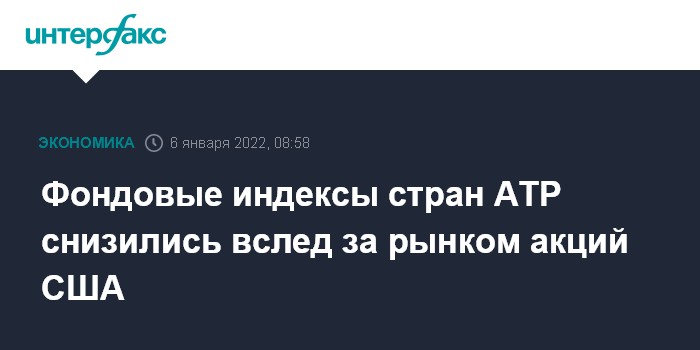 Москва. 6 января. INTERFAX.RU - Фондовые индексы государств Азиатско-Тихоокеанского региона (АТР) опускаются в ходе торгов в четверг на фоне падения накануне американского фондового рынка после публикации протокола декабрьского заседания Федеральной резервной системы (ФРС) США.