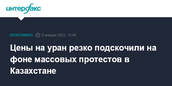 Москва. 6 января. INTERFAX.RU - Цены на уран резко выросли на фоне массовых протестов в Казахстане, являющемся крупнейшим в мире производителем урана, сообщает агентство Bloomberg.