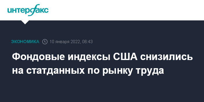 Москва. 10 января. INTERFAX.RU - Основные индексы американского фондового рынка завершили торги в пятницу снижением на фоне статистических данных о числе рабочих мест в США, оказавшихся хуже ожиданий аналитиков.