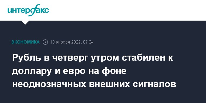 Москва. 13 января. INTERFAX.RU - Изменения доллара США и евро на старте торгов "Московской биржи" в четверг незначительные, рубль стабилен к бивалютной корзине на фоне неоднозначных внешних сигналов.