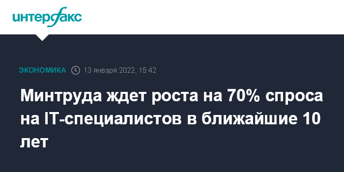 Москва. 13 января. INTERFAX.RU - В ближайшие 10 лет на рынке труда вырастет потребность в специалистах IT-сферы, индустрии гостеприимства и развлечений, а также науки и здравоохранения, прирос специалистов в сфере IT в ближайшие 8-10 лет составит около 70%, заявил на XIII Гайдаровском форуме глава Минтруда Антон Котяков.