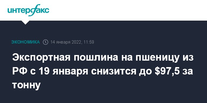 Москва. 14 января. INTERFAX.RU - Экспортная пошлина на пшеницу из РФ с 19 января снизится до $97,5 с $98,2 за тонну, сообщил Минсельхоз.