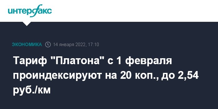 Москва. 14 января. INTERFAX.RU - Тариф госсистемы взимания платы с грузовиков массой более 12 тонн за проезд по федеральным автодорогам "Платон" с 1 февраля 2022 года будет проиндексирован на 20 копеек: с текущих 2,34 руб./км до 2,54 руб./км, сообщило Федеральное дорожное агентство (Росавтодор).