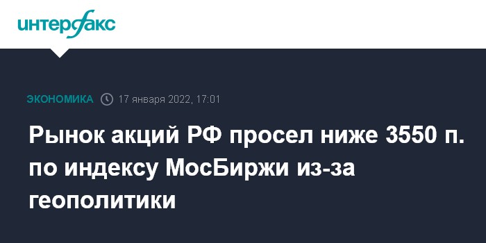 Москва. 17 января. INTERFAX.RU - Рынок акций РФ в понедельник остается под давлением западных распродаж из-за геополитической напряженности вокруг России, индекс МосБиржи просел ниже 3550 пунктов во главе с бумагами финансовых и металлургических компаний; бумаги Сбербанка обновили минимум с ноября 2020 года.