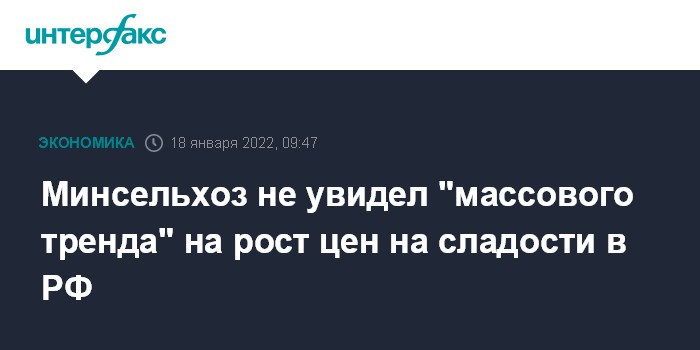 Москва. 18 января. INTERFAX.RU - Минсельхоз не видит "массового тренда" на повышение цен на кондитерские изделия в РФ.