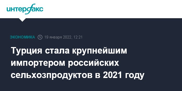 Москва. 19 января. INTERFAX.RU - В 2021 году Турция заняла первое место по импорту российской сельхозпродукции, сообщил центр "Агроэкспорт" при Минсельхозе со ссылкой на предварительные данные Федеральной таможенной службы.