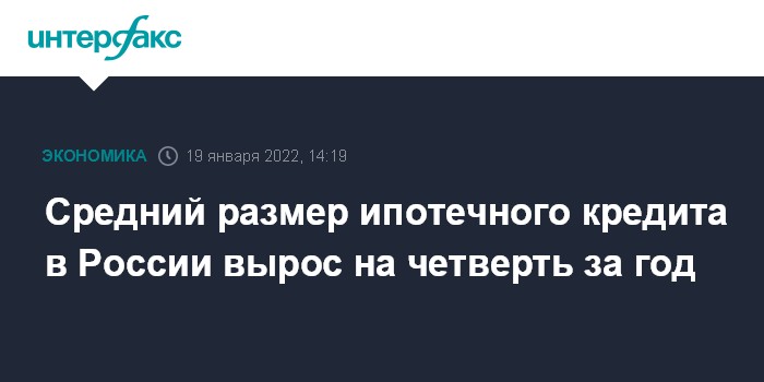 Москва. 19 января. INTERFAX.RU - В России на 25% увеличился средний размер ипотечного кредита за 2021 год, средний срок кредитования вырос почти до 20 лет, сообщает Объединенное кредитное бюро (ОКБ).