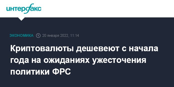 Москва. 20 января. INTERFAX.RU - Крупнейшие мировые криптовалюты продолжили ослабление с началом 2022 года на фоне ожиданий, что Федеральная резервная система (ФРС) США в скором времени начнет ужесточать денежно-кредитную политику.