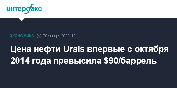 Москва. 20 января. INTERFAX.RU - Стоимость российской нефти Urals в Средиземноморье 19 января в абсолютном выражении превысила $90/баррель впервые с октября 2014 года вслед за ростом мировых котировок и вследствие повышения спроса на российский сорт, пишет ценовое агентство Argus.