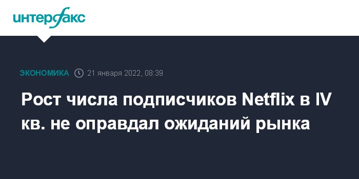Москва. 21 января. INTERFAX.RU - Чистый прирост числа пользователей Netflix Inc, крупнейшего в мире сервиса потокового видео по подписке, в четвертом квартале 2021 года не оправдал ожиданий рынка, компания дала слабый прогноз.