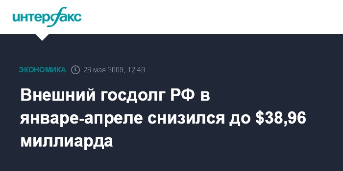 Москва. 26 мая. INTERFAX.RU - Внешний госдолг РФ в январе-апреле 2009 года, по оценке Минэкономразвития, снизился на 4,0% - до $38,96 млрд по состоянию на 1 мая против $39,46 млрд на 1 апреля и $40,57 млрд на 1 января, говорится в распространенном министерством мониторинге ситуации в российской экономике.