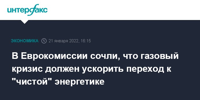 Москва. 21 января. INTERFAX.RU - Разразившийся в мире газовый кризис должен способствовать ускорению перехода к "чистой" энергетике, уверена глава Еврокомиссии Урсула фон дер Ляйен.