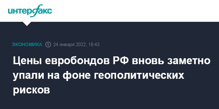 Москва. 24 января. INTERFAX.RU - Котировки российских еврооблигаций в понедельник вновь заметно упали на фоне сохраняющихся геополитических рисков. Стоимость пятилетней страховки от дефолта (CDS) достигла 240 базисных пунктов против 207 пунктов в конце прошлой недели.