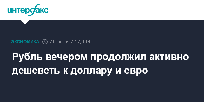 Москва. 24 января. INTERFAX.RU - Доллар и евро уверенно растут на "Московской бирже" в понедельник вечером, рубль продолжает активно дешеветь к бивалютной корзине на фоне резкого ухудшения геополитической обстановки вокруг РФ и падения интереса глобальных инвесторов к риску в ожидании ужесточения денежно-кредитной политики Федеральной резервной системы (ФРС) США.