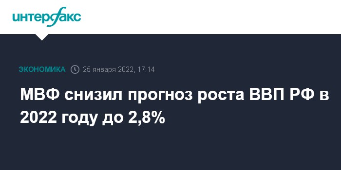 Москва. 25 января. INTERFAX.RU - Международный валютный фонд (МВФ) продолжил снижать свою оценку роста российской экономики в 2022 году до 2,8% с 2,9%, ожидавшихся им в октябре, 3,1%, прогнозировавшихся в июле и 3,8%, в которые он оценивал рост в апреле прошлого года. В 2023 году, как ожидает МВФ, рост российской экономики составит 2,1% (было 2%).