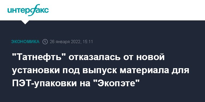 Москва. 26 января. INTERFAX.RU - "Татнефть" отказалась от планов строительства на предприятии "Экопэт" (Калининград) новой установки полиэтилентерефталата (ПЭТФ), сообщил "Интерфаксу" генеральный директор АО "Экопэт" Александр Аникеев.