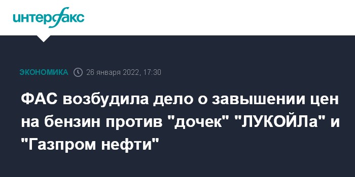 Москва. 26 января. INTERFAX.RU - Федеральная антимонопольная служба (ФАС) возбудила дело по признакам завышения цен на бензин в отношении "дочек" "ЛУКОЙЛа" и "Газпром нефти" в Нижегородской области, сообщил замглавы ведомства Виталий Королев на заседании окружных штабов в территориальных органах ведомства по мониторингу за ситуацией на рынке нефтепродуктов.