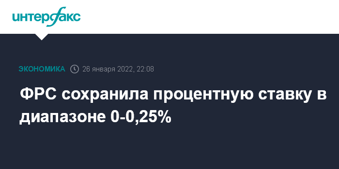Москва. 26 января. INTERFAX.RU - Федеральная резервная система (ФРС) сохранила процентную ставку по федеральным кредитным средствам (federal funds rate) в диапазоне от 0% до 0,25% годовых, говорится в коммюнике Федерального комитета по операциям на открытом рынке (FOMC) по итогам заседания, прошедшего 25-26 января.