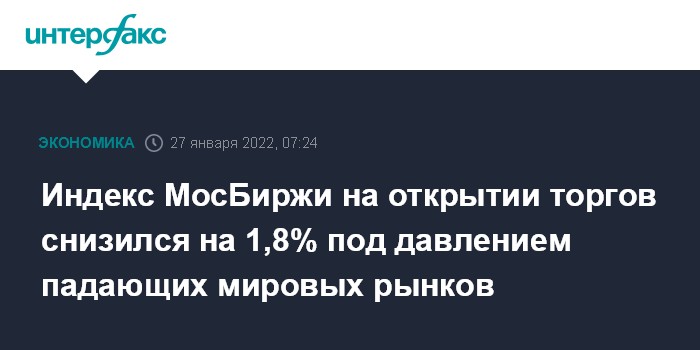 Индекс МосБиржи на открытии торгов снизился на 1,8% под давлением падающих мировых рынков