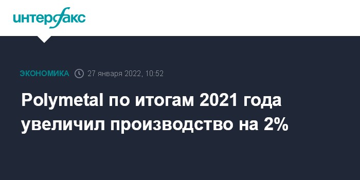 Москва. 27 января. INTERFAX.RU - Polymetal по итогам 2021 года увеличил производство на 2%, до 1,677 млн унций при прогнозе в 1,6 млн унций, сообщила компания.