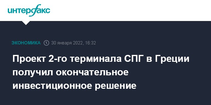 Москва. 30 января. INTERFAX.RU - Принято окончательное инвестиционное решение о строительстве в Греции второго терминала по приему сжиженного природного газа - в Александруполисе, сообщил оператор проекта Gastrade SA.