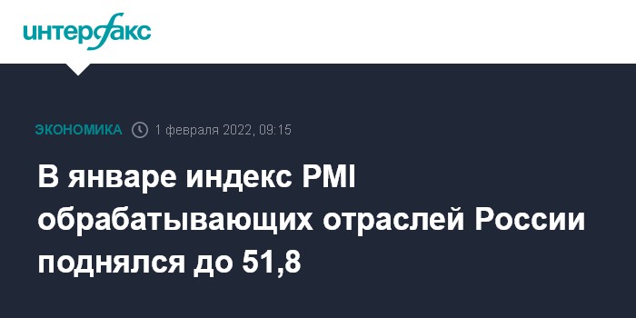 Москва. 1 февраля. INTERFAX.RU - В январе 2022 года индекс PMI обрабатывающих отраслей России составил 51,8 пункта, слегка поднявшись с декабрьского значения 51,6 пункта, показало исследование IHS Markit.