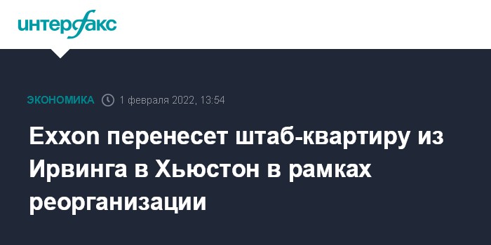 Москва. 1 февраля. INTERFAX.RU - Крупнейшая нефтегазовая компания США Exxon Mobil Corp (ExxonMobil) переносит штаб-квартиру из Ирвинга, штат Техас, в Хьюстон в рамках реорганизации бизнеса, которая, по словам компании, будет завершена к 2023 году.