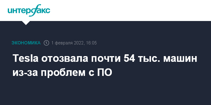 Москва. 1 февраля. INTERFAX.RU - Американская Tesla Inc., производитель электрокаров, отзывает 53 882 автомобилей из-за проблем с безопасностью, связанных с ПО режима автономного вождения.