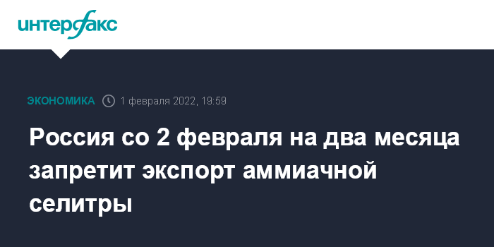 Москва. 1 февраля. INTERFAX.RU - Россия со 2 февраля вводит двухмесячный запрет на экспорт аммиачной селитры.