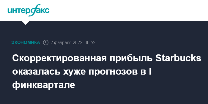 Москва. 2 февраля. INTERFAX.RU - Американская Starbucks Corp., владеющая крупнейшей в мире сетью кофеен, в первом квартале 2022 финансового года увеличила чистую прибыль и выручку, причем скорректированная прибыль оказалась хуже прогнозов рынка, а выручка превзошла ожидания.